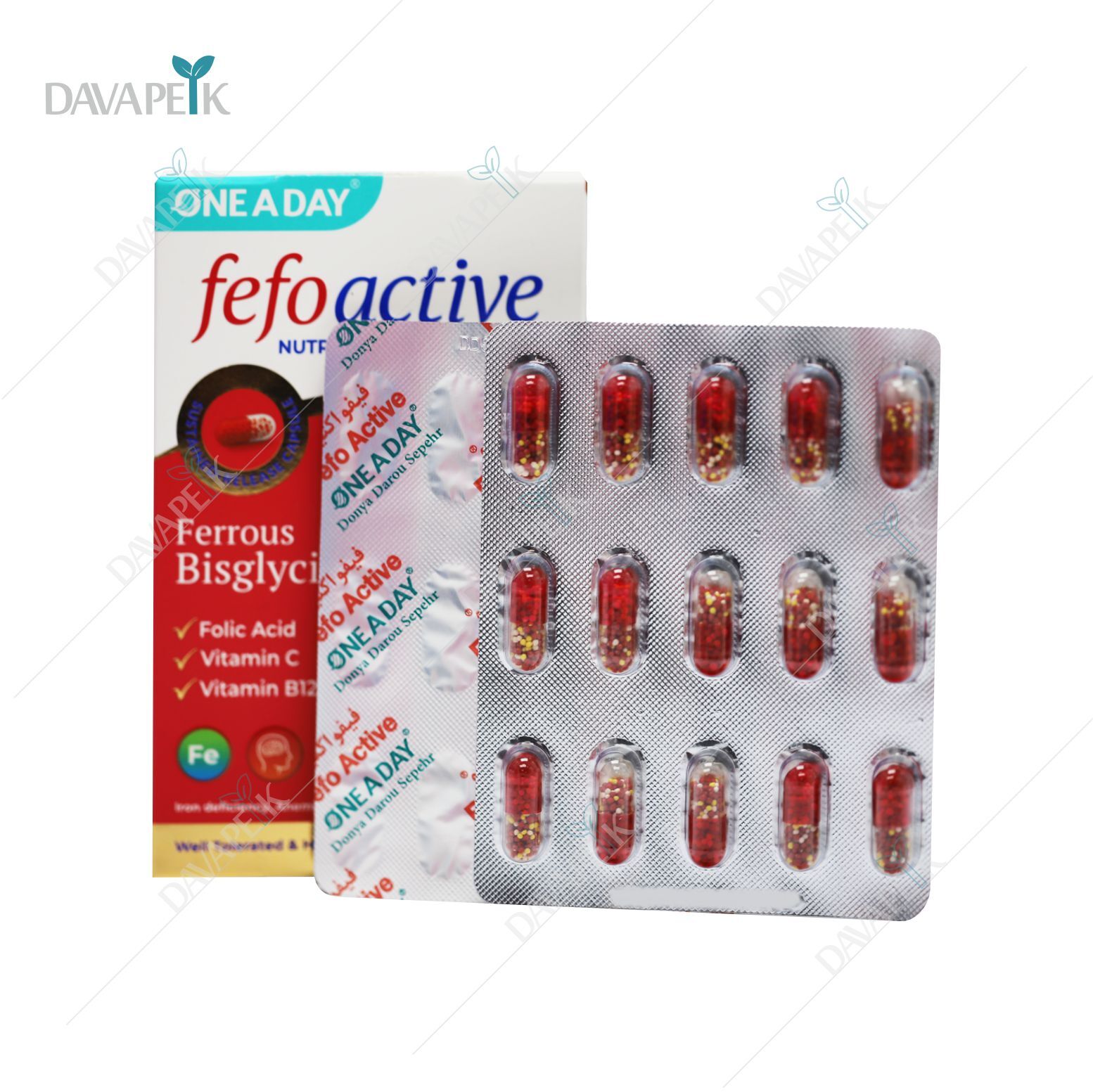 فیفو اکتیو وان ا دی کمک به تامین آهن و فولیک اسید ضروری ، افزایش انرژی ، کاهش خستگی و حمایت از سلامت عمومی بدن کمک می کند. One A Day Fefo Active Capsules علاوه بر 28 میلی گرم آهن و فولیک اسید حاوی ویتامین B12 و ویتامین C برای جذب بهتر آهن می باشد.