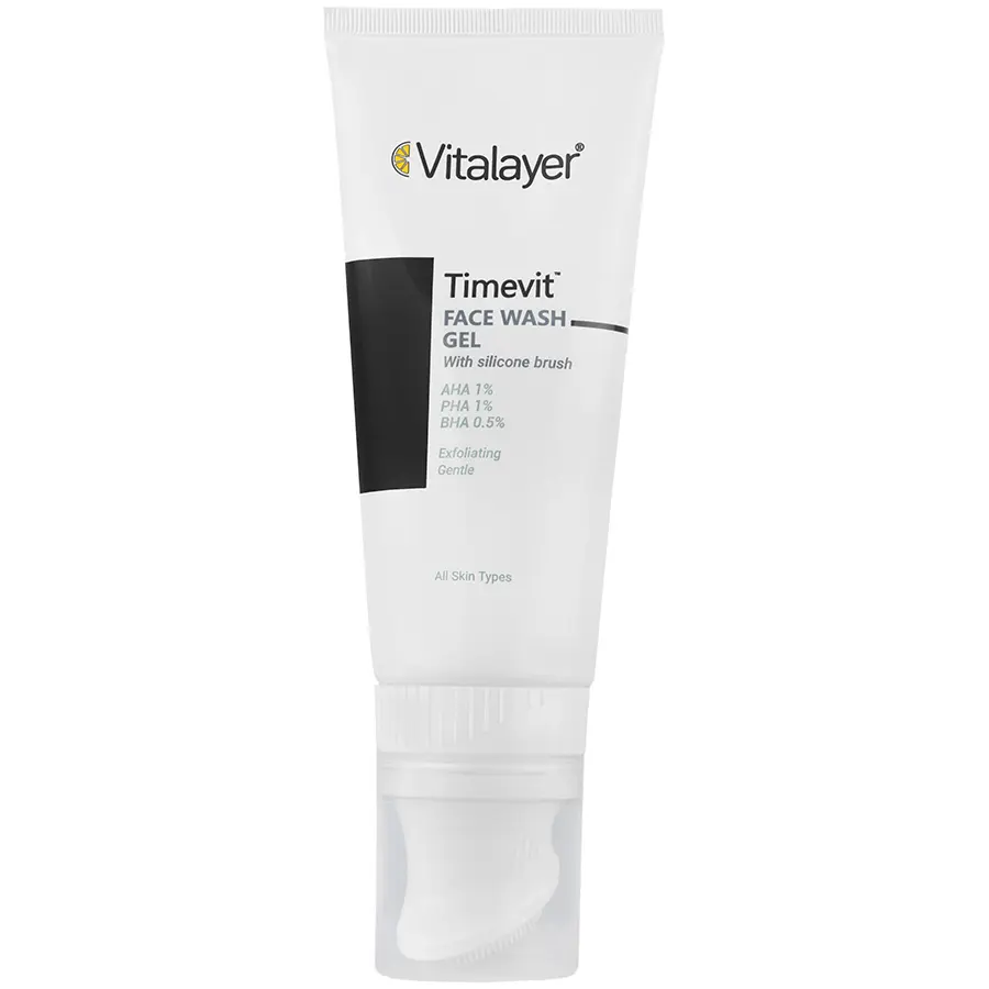 ژل شستشوی صورت تایم ویت ویتالیر حاوی سورفکتانت های ملایم غیر صابونی و اسید های PHA، AHA و BHA با خاصیت لایه برداری ملایم، مناسب انواع پوست، شفاف کننده و شاداب کننده پوست بوده که به همراه یک براش سیلیکونی عرضه می شود.