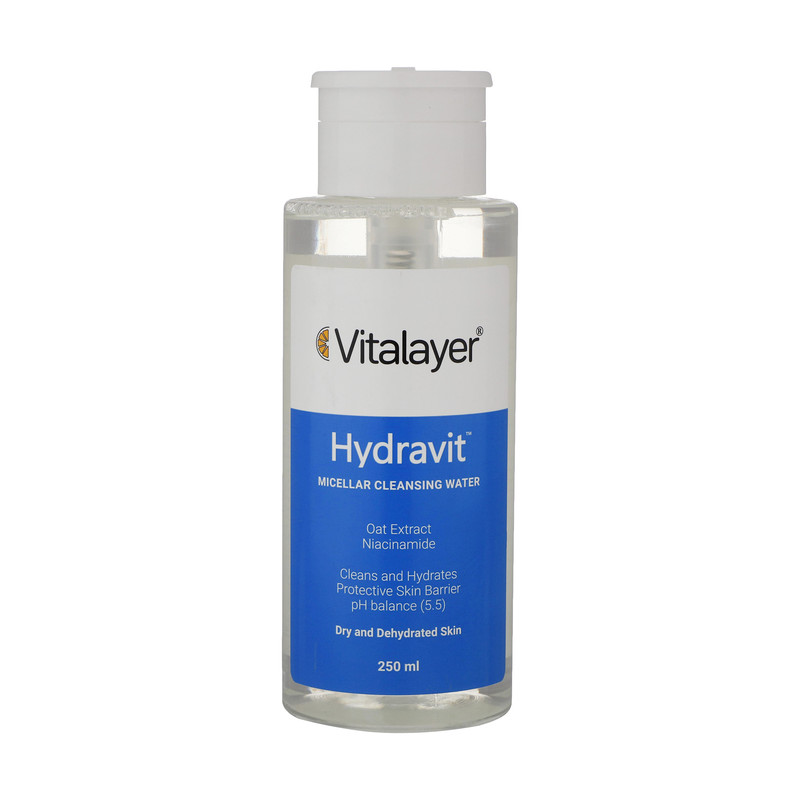 محلول پاککننده آرایش ویتالیر، سازگار با پوستهای خشک، حاوی عصاره جو دو سر و نیاسینامید با خاصیت پاککننده ملایم و سریع، مرطوبکنندگی، آبرسانی، حفظ چربی مفید و جلوگیری از خشکی پوست، حجم 250 میلیلیتر، مدل هیدراویت