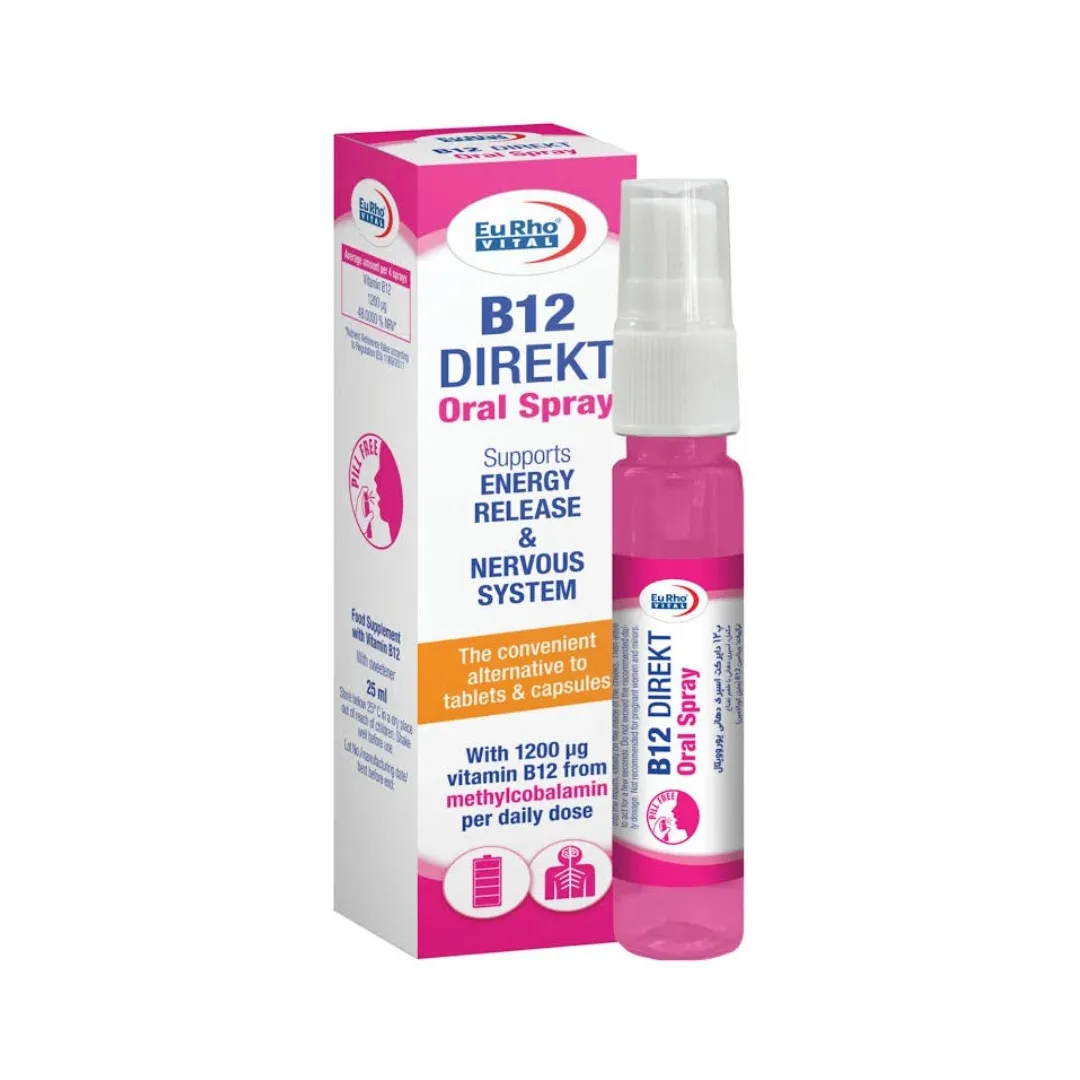 اسپری دهانی ویتامین ب 12 دایرکت یوروویتال با جذب مستقیم از مخاط دهان، موجب تقویت سیستم عصبی، درمان کمخونی مگالوبلاستیک و افزایش فوری سطح انرژی بدن میشود.