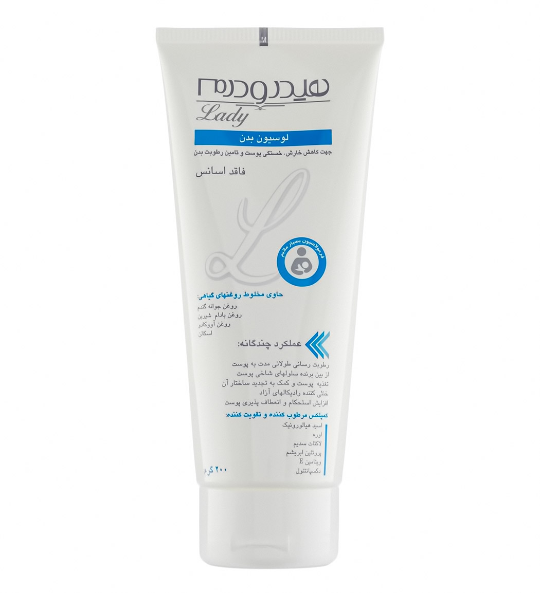 لوسیون بدن لیدی هیدرودرم گزینه مطمئن برای خانم هایی است که با خشکی، خارش یا کشیدگی پوست روبه رو هستند. فرمول آبرسان و آرام بخش آن با تقویت سد محافظ و کم کردن تبخیر آب، رطوبت را برای زمان طولانی نگه می دارد. اسید هیالورونیک، اوره، گلیسیرین و پروتئین ابریشم به تغذیه، کمک به بازسازی و لطافت کمک می کند و در کنار روغن آووکادو، بادام و جوانه گندم، نرمی و طراوت ماندگار می دهد. این لوسیون در دوران بارداری برای کنترل خشکی قابل استفاده است.