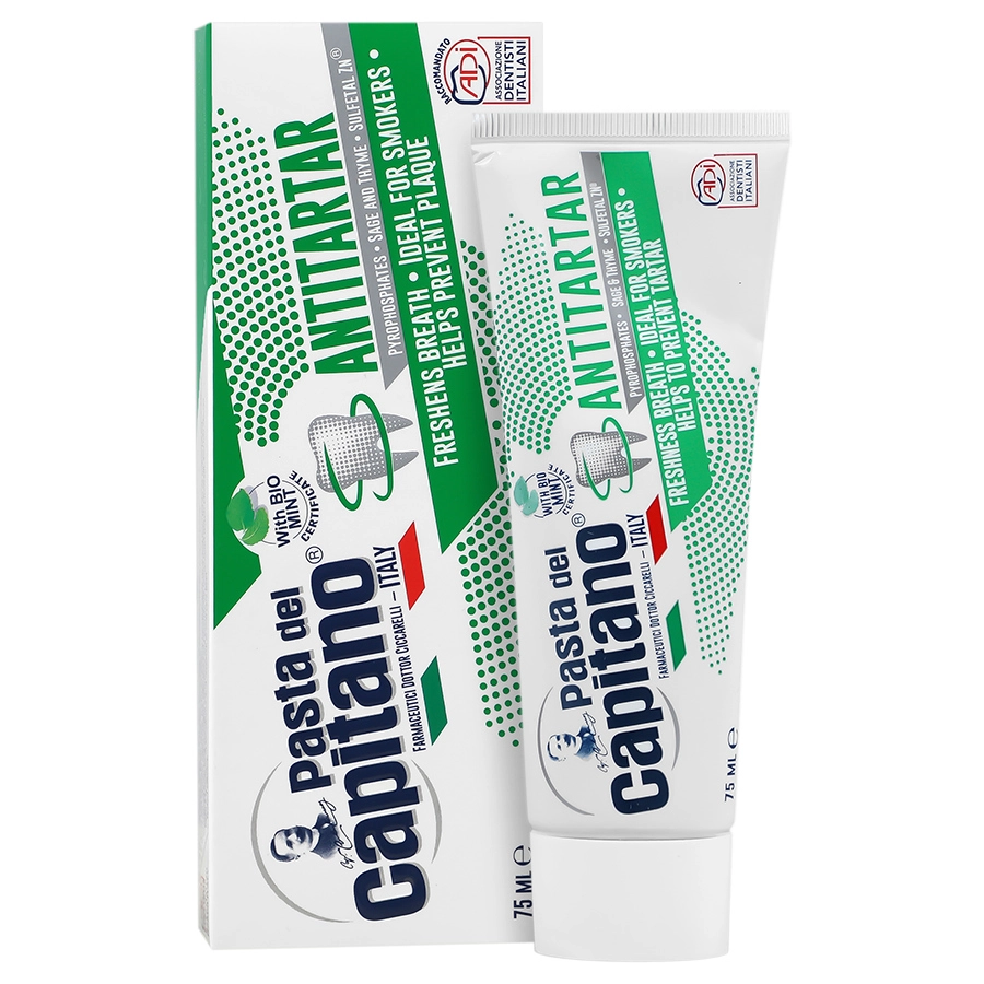 خمیر دندان آنتی تارتار کاپیتانو مخصوص افراد سیگاری می باشد. مناسب برای افرادی که تنباکو، سیگار و یا قهوه و چای مصرف می کنند و به همین سبب رنگدانه هایی بر روی دندان های آن ها شکل می گیرد. این خمیر دندان حاوی فلوراید سدیم برای جلوگیری از پوسیدگی و سفید کردن دندان ها است. از کارایی های دیگر خمیر دندان مخصوص سیگاری ها خوشبو کننده دهان و از بین برنده بوی بد سیگار می باشد که نگرانی افراد را برطرف می کند.وجود عصاره پنیرک در این خمیر دندان از ایجاد التهاب و عفونت در دندان و لثه افراد، به خصوص افراد سیگاری که اغلب دچار بیماری های دهان و دندان می شوند، جلوگیری می کند.